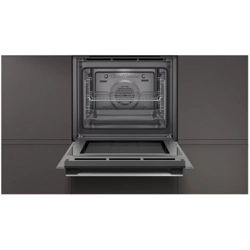 Духовой электрический шкаф Neff B1ACE0AN0R оснащён особой технологией CircoTherm, которая позволяет готовить одновременно до трёх блюд на разных уровнях. Такая функция предполагает равномерную циркуляцию воздуха: воздушные потоки направляются с задней стенки бесшумным вентилятором. Нагретый воздух обдувает все уровни камеры, благодаря чему блюда равномерно и быстро готовятся, сохраняют сочность и не лишаются индивидуальных ароматов. Даже при открывании дверцы запахи не смешиваются, не происходит потеря тепла. С таким функциональным кухонным прибором вы легко, быстро и с минимальным расходом электроэнергии приготовите обед на всю семью или праздничный ужин. Духовой электрический шкаф имеет семь различных режимов приготовления: бережное тушение для нежной текстуры, гриль для придания румяной корочки овощам, рыбе или мясу, брожение для идеального дрожжевого теста и йогуртов собственного приготовления, нижний и верхний жар для стандартной универсальной готовки, нижний отдельный жар для открытых пирогов и воздушного суфле, размораживание для замороженных продуктов, подогрев посуды, разогрев блюд и поддержание их постоянных температур, а также приготовление потрясающей пиццы. Вместе с Neff B1ACE0AN0R вы станете настоящим кулинаром! Чистка камеры не отнимет много времени и сил благодаря эмалевому покрытию с особым антрацитовым слоем, а также закруглённым краям. Внутреннее пространство минимально загрязняется и максимально просто очищается. Задавать опции очень удобно поворотными переключателями, которые полностью утапливаются в корпус. Также панель управления имеет сенсорные кнопки и цветной дисплей для полного контроля процесса готовки. Камера полностью просматривается благодаря галогенной подсветке: вы хорошо видите, что происходит внутри, и как выглядит ваше блюдо. Дверца не нагревается благодаря двухслойной конструкции. Часы EasyClock позволяют следить за временем. А чтобы дети случайно не нажали на кнопки, воспользуйтесь опцией блокировки.