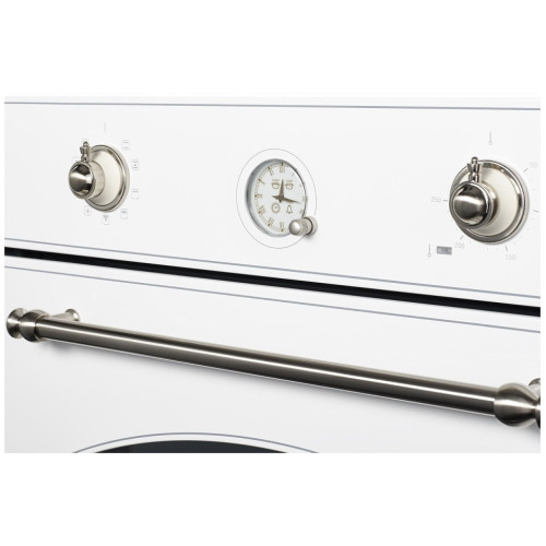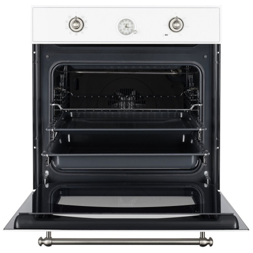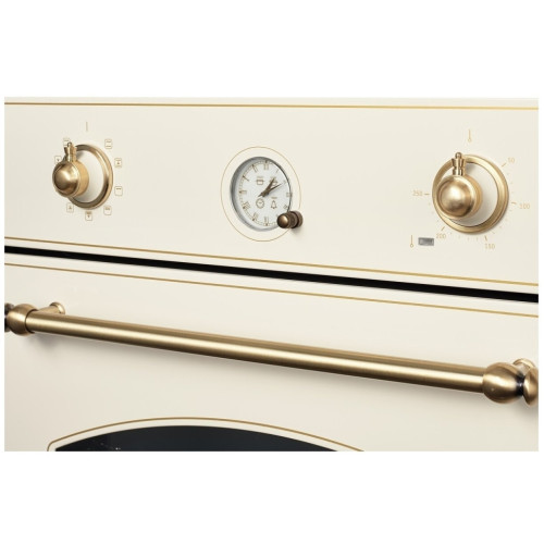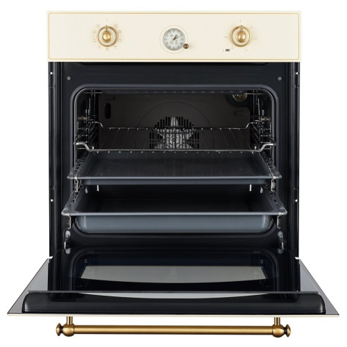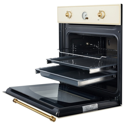 АУТЕНТИЧНЫЙ ТАЙМЕР Таймер оформленный под старинные часы с римским циферблатом, подчеркнет интерьер вашей кухни, добавив аутентичности своим видом. Так же сохраняет все современные функции и легок в управлении. МЕТАЛЛИЧЕСКАЯ ФУРНИТУРА Фурнитура духового шкафа из металла ручной работы. Индивидуальный подход к изготовлению каждого элемента из металла, гарантирует надежность и долгий срок службы. Эстетичный дизайн элементов из металла подчеркивает духовой шкаф и создает особенный антураж всей кухни. ОХЛАЖДЕНИЕ ДВЕРЦЫ ДУХОВКИ 3 СТЕКЛА Первое внутренние стекло атермальное, возвращает часть тепла обратно в камеру духовки, что ускоряет процесс набора заданной температуры, а также благоприятно влияет на процесс приготовления. Второе стекло установлено между атермальным и фасадным стеклом, способствует раздельному циркулированию потоков воздуха вентиляции дверцы. Вся конструкция легко разбирается без дополнительных инструментов, позволяет проводить очистку каждого стекла отдельно. РАЗМОРОЗКА Функция разморозки быстро и эффективно подготовит продукт к готовке. Вам больше не понадобится размораживать продукты в комнатной температуре или холодильнике. ТУРБО РЕЖИМ Приготовление на нескольких уровнях, это особенность турбо режима предназначенная для равномерного нагрева всего объема духовки. Вам не нужно думать где лежит ваше блюдо, интенсивность температуры одинаковая во всей камере и готовка идет с равномерным нагревом. ДВУХУРОВНЕВЫЕ ТЕЛЕСКОПИЧЕСКИЕ НАПРАВЛЯЮЩИЕ Легко снимающиеся телескопические направляющие на двух уровнях обеспечивают удобство и эффективность работы с духовкой. Многоуровневая система установки позволяет расположить направляющие на нужном вам уровне. Вся конструкция может быть полностью разобрана без дополнительных инструментов, что дает возможность с легкостью проводить чистку камеры и телескопов. СЪЕМНАЯ И ПОЛНОСТЬЮ РАЗБОРНАЯ ДВЕРЬ Если вы решили провести полную чистку духовки, вы сможете легко снять дверь, снять с нее стекла и промыть все уголки и закрытые места. Потом вы, с той же легкостью, сможете ее собрать и установить обратно, без специальных инструментов. КОМПЛЕКТ ПРОТИВНЕЙ В комплекте с духовкой идут два противня с покрытием ProCook, стандартный и глубокий, а также решетка. Глубокий противень имеет сток для жира, повышающий эффективность готовки блюд с высоким жировыделением. Решетка имеет универсальную форму, может быть установлена как отдельно, так и внутри глубокого противня, имеет защитное ребро фиксирующие расположения блюда с внутренней стенки и ножки для удобного расположения на столе. ПАРОВАЯ ОЧИСТКА Для облегчения ухода за чистотой камеры духовки, вы можете воспользоваться функцией очистки паром. Налив в противень воду и запустив режим, вода испаряясь будет образовывать пар, который размягчит жир и грязь осевшие внутри камеры духовки. После завершения, процесс уборки исключит оттирания засохшей и прикипевшей грязи. CRYSTAL CLEAN Эмаль легкой очистки Crystal clean, упростит уборку камеры духовки. Если вы начнете уборку через 1-3 часа после завершения готовки, эмаль Crystal clean гарантирует легкую очистку жира и других элементов грязи в камере. Достаточно будет протереть ее влажной тряпкой. КЛАСС ЭНЕРГОПОТРЕБЛЕНИЯ А Маркировки энергоэффективности товара производителем, обязатель