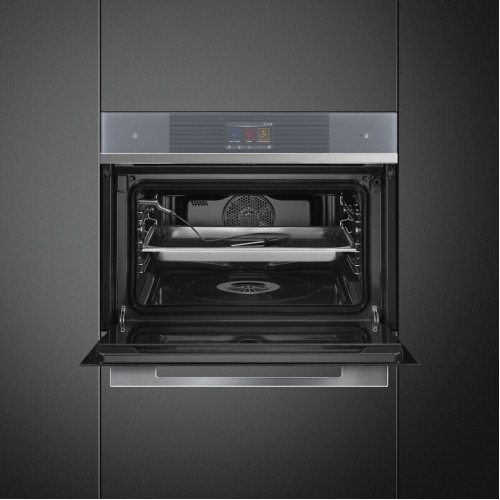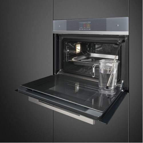 Компактный многофункциональный духовой шкаф, комбинированный с пароваркой с функцией SmegConnect имеет 15 функций приготовления, 5 из которых с использованием пара, 65 автоматических программ и 64 свободных персональных рецептов, которые вы можете запрограммировать под себя. Функции, опции, температура * 15 функций приготовления (5 с использованием пара) * Функции очистки: паровая очистка * Другие функции: размораживание по времени, размораживание по весу, поднятие теста, шаббат, разогрев и регенерация * 65 автоматических программ * 64 свободных персональных рецептов * Электронный программатор: таймер, отсрочка включения, автоматическое выключение в конце программы * Акустический сигнал окончания приготовления * Режим Showroom * Режим ограничения мощности * Электронный контроль температуры (30-250ºС) * Быстрый предварительный разогрев * Система плавного закрывания дверцы Soft Close Аксессуары в комплекте: * Глубокий эмалированный противень, 40 мм * Решетка для противня * 1 противень глубокий из перфорированной стали * 1 противень из нержавеющей стали, 20 мм * 1 решетка с задним упором * Телескопические направляющие неполного выдвижения * Термощуп * Губка/ Крышка парогенератора