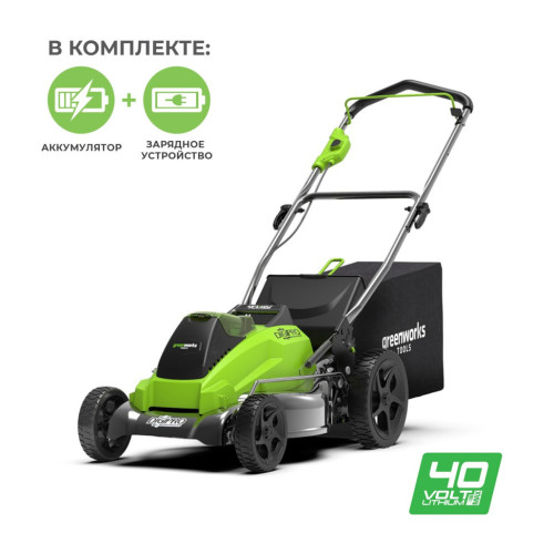 Комплект, состоящий из аккумуляторной газонокосилки Greenworks линейки устройств 40 вольт (модель GD40LM45K4) + аккумуляторная батарея 4 А/ч + зарядное устройство. Косилка этой модели относится к разряду полупрофессиональных устройств. В ней установлен бесщёточный (индукционный) двигатель серии DigiPro, который сопоставим по мощности с бензиновыми двигателями, имеет повышенный крутящий момент. Эти двигатели отличаются большей надёжностью (в отличии от обычных щёточных), а также не требуют обслуживания и довольно неприхотливы в эксплуатации. Газонокосилка имеет ширину скашивания 45 см, обладает функцией мульчирования, сбора травы в травосборник и функцию бокового выброса травы. Мешок для сбора травы на 50 литров с металлическим каркасом и индикатором наполнения травой. Отличительные особенности аккумуляторной техники - малый вес, низкий уровень шума и вибраций, экологичность и безопасность для вашего здоровья, а также для окружающей среды. Согласитесь - это внушительные достоинства, чтобы с умом подойти к покупке. Корпус газонокосилки выполнен из специального пластика, при попадание небольших камней на который он не потрескается, а дека газонокосилки выполнена из стали. Есть регулировка высоты скашивания от 20 мм до 70 мм со стальным приводом на все колеса. Важной особенностью газонокосилки является система защиты двигателя от механических повреждение, например при наезде на камень. Время автономной работы (примерно, и зависит от некоторых параметров) - до 600 м² от 4 А/ч батареи. Для защиты от случайного включения, предусмотрен специальный ключ безопасности и кнопка-предохранитель. Для удобства хранения ручка газонокосилки складывается. Газонокосилка работает от аккумуляторной батареи G-MAX 40V (4 А/Ч в комплекте, или 2 А/ч в комплект не входит), которую можно использовать другими с устройствами из линейки 40 вольтовой серии. Особенно рады такой косилке будут женщины потому, что её не нужно заполнять бензином, обслуживать и вообще совершать какие либо манипуляции, известные, как правило, только мужчинам. А если еще подумать о своем здоровье (отсутствие выхлопов СО2) и экологии, то эта косилка будет самым разумным вложением средств. От младших моделей эта газонокосилка отличается более широкой полосой скашивания (45 см.), наличием функции бокового выброса травы, металлической декой и увеличенным мешком для сбора травы и готовой сборкой с АКБ и ЗУ. Преимущества модели: Мощный бесщёточный двигатель серии DigiPro; Мощность, сопоставимая с бензиновыми аналогами; Время автономной работы - до 600 м² от 4 А/ч батареи; Стальная дека; Ширина скашивания 45 см.; Функция мульчирования; Боковой выброс травы; Травосборник 50 л., металлический каркас и индикатор наполнения; Регулировка высоты скашивания 20 - 70 мм.; Защита двигателя от механических повреждений; Ключ безопасности и кнопка-предохранитель; Складная ручка для удобства хранения; Работа от 40V аккумулятора, совместимого с другими устройствами из линейки 40V; Гарантия 2 года. Состав комплекта: G-MAX 40V аккумуляторная газонокосилка, арт.  2500407, модель GD40LM45; Аккумулятор 4 А/ч G-MAX 40V, арт. 29727; Зарядное устройство G-MAX 40V, арт. 2904607; Заглушка для мульчирования; Вставка для бокового выброса; Травосборник; Руководство по эксплуатации; Гарантийный талон.