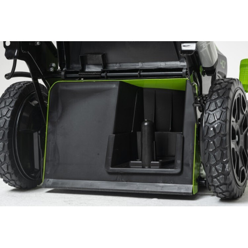 Газонокосилка аккумуляторная Greenworks GD40LM48SP, (артикул 2517407), 40V, 48 см, самоходная, бесщеточная, без АКБ и ЗУ - это мощная, универсальная и практичная самоходная газонокосилка из линейки 40V. Аккумуляторный инструмент по сравнению с бензиновым прост в эксплуатации (не нужна топливно – масляная смесь), включается одной кнопкой, абсолютно экологичен, работает гораздо тише, отличается низким уровнем вибрации. Обладает низкой стоимостью эксплуатации – только затраты на электроэнергию. При этом мощность сопоставима с бензиновыми аналогами. Данная модель оснащена надежным инновационным бесщёточным двигателем DigiPro с высоким крутящим моментом, еще более низким уровнем шума, чем у стандартных электрических двигателей. Газонокосилка имеет привод на задние колёса. Скорость движения регулируется в диапазоне 2,5-4,9 км/ч, что важно при обработке больших участков различного профиля. Длительная непрерывная работа обеспечивается функцией Switchover. В батарейный отсек устанавливаются сразу два аккумулятора. После разрядки первого происходит автоматическое переключение на второй. Но, в то же время, установка сразу 2-х батарей не обязательна. При работе на участке с густой травой, Вы можете нажать клавишу Turbo на рукояти газонокосилки. При нажатии и удержании клавиши обороты двигателя повышаются до 3100 оборотов в минуту, что позволяет выкосить особенно сложные участки. Обратите внимание, что использование Turbo, приводит к повышенному потреблению энергии аккумулятора. Большая ширина скашивания 48 см позволяет обрабатывать площадь до 900 м2. Особая система складывания рукоятки, позволяет быстро сложить газонокосилку и хранить ее вертикально, что позволит Вам экономить пространство. Данная модель оснащена функцией 3-в-1: мульчирование, сбор травы в травосборник и боковой выброс. Вместительный травосборник объёмом 55 литров продлевает время непрерывного кошения. Регулировка высоты кошения в диапазоне от 25 до 80 мм (7 уровней) осуществляется централизованно одной ручкой. Внимание: этот комплект поставляется без аккумулятора (АКБ) и зарядного устройства (ЗУ). []Ширина 575 мм []Высота 445 мм []Глубина 950 мм []Вес 33 кг