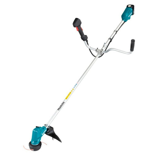 Триммеры с аккумуляторным питанием давно производятся компанией Макита, и в 2021 году их ряд дополнился несколькими интересными моделями. Агрегат Makita DUR190UZX3 с «велосипедной» рукояткой сосредоточил в своей конструкции весь опыт производства и эксплуатации «электрокос». Его мощности хватает для производительной работы (ширина скашивания – 30 см) – привод питается от батареи напряжением 18 Вольт. Ещё одна особенность – пониженный уровень шума. Есть у триммера Makita DUR190UZX3 и другие немаловажные достоинства: * небольшой вес (менее 3,4 кг), эргономичная и сбалансированная компоновка; * простая замена режущего элемента – блокировка вала без инструмента; * автоматическое поддержание крутящего момента при изменении нагрузки – технология ADT; * высокоскоростной бесщеточный привод с повышенной экономичностью; * три скорости с электронным переключением одной кнопкой; * плавный пуск; * электрический тормоз; * пыле- и водонепроницаемость конструкции по технологии ХРТ; * защита аккумулятора и привода с индикацией причины блокировки; * комплектуется триммерной головкой и плечевым ремнем. Аккумулятор в комплект поставки триммера Makita DUR190UZX3 не входит. К этой модели подойдет любой литиевый слайдер серии BL18XX емкостью от 1,5 до 6 А-час. Зарядное устройство – из серии DC18XX. Их можно приобрести у официального представителя компании Макита, как и другие расходники. Вместо головки с леской в агрегат можно установить нож с разным количеством зубьев. Триммер Makita DUR190UZX3 оснащен электроникой, существенно повышающей удобство работы. В первую очередь это система защиты привода и батареи, увеличивающая их ресурс. Двигатель автоматически отключается при перегрузке, перегреве и недопустимом разряде батареи. Для индикации причины имеется специальный индикатор, который загорается при перегреве и начинает мигать при перегрузке и разряде аккумулятора. Другая пара индикаторов в триммере Makita DUR190UZX3 индицируют скорость привода и включение режима ADT. При разряде батареи они гаснут. Регулировка скорости производится последовательным нажатием на кнопку включения питания. Значений три – 3500, 5100 и 6000 об/мин. Автоматический выбор оптимального значения скорости сопровождается включением отдельного индикатора на панели управления. Включение вращения головки в триммере Makita DUR190UZX3 производится триггерным переключателем, который для безопасности оснащен рычагом разблокировки. Если инструмент долго не использовать, питание отключится автоматически. Ещё одна полезная функция – реверс для очистки от налипшего мусора. Обратное вращение активируется одновременным нажатием специальной кнопки и на блокировочный рычаг. В этом режиме при нажатии на триггерный переключатель начинает мигать индикатор ADT.