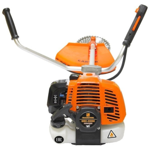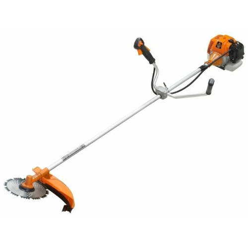 тип триммера: переносной мощность ДВС 1.5 л.с. двухтактный двигатель емкость топливного бака 0.85 л ширина скашивания 23 см режущий элемент триммера: леска и нож, леска 2.40 мм конструкция штанги: прямая форма рукояти: Т-образная (велосипедная) плечевой ремень наличие колес: нет вес 7.3 кг