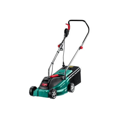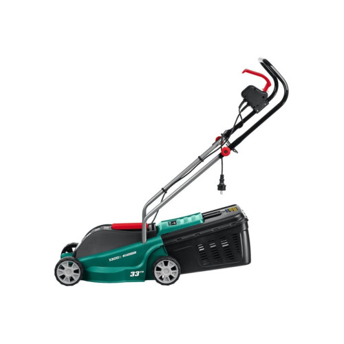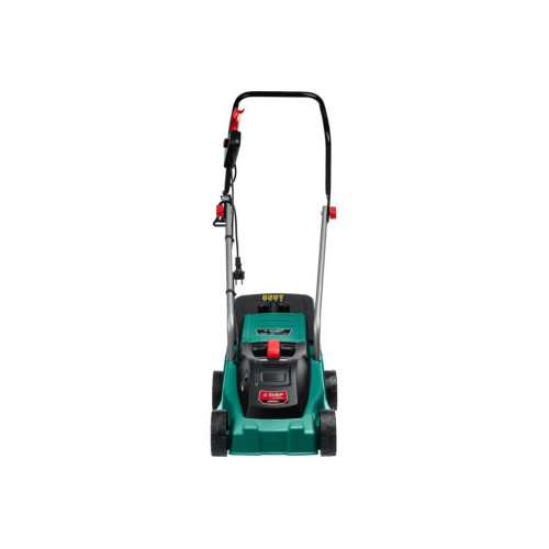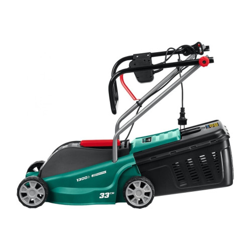 Газонокосилка электрическая Зубр ГС-33-1300 - легкий инструмент для ухода за приусадебным участком. Расширенная функциональность, современный дизайн и простота работы. Подходит для подстригания травы при уходе за газоном (с вращающимся ножом). Имеет функции кошения со сбором травы и регулировки высоты кошения. Преимущества * Удобное средство для кошения газона на небольшом участке * Прекрасная альтернатива бензиновой газонокосилке: меньшее потребление энергии при той же режущей способности, отсутствие необходимости постоянной покупки ГСМ и контроля уровня топлива и масла, простота эксплуатации и ремонта, а также меньшие шум и вибрация и полное отсутствие вредных выбросов * Травосборник позволяет поддерживать чистоту на обработанном участке и упрощает утилизацию травы * Широкий диапазон и ступенчатая регулировка высоты кошения расширяют возможности применения газонокосилки * Облегченные колеса и эргономичная рукоятка облегчают перемещение косилки по газону * Нож специальной формы создает восходящий поток воздуха, который поднимает полегшую траву, направляет скошенную траву в травосборник и даже может собирать опавшую листву * Органы управления расположены под рукой (на рукоятке), что повышает удобство и безопасность работы * При потере контроля над машиной режущий инструмент и двигатель останавливаются * Тормоз двигателя мгновенно останавливает вращение ножа при отключении питания для большей безопасности