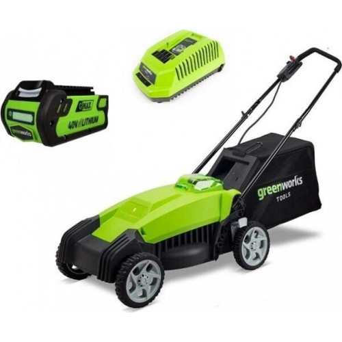 Газонокосилка аккумуляторная GREENWORKS 40V (2500067VA) является стартовой моделью в линейке аккумуляторных 40-вольтовых газонокосилок Greenworks. Ширина скашивания у этой косилки 35 см, она обладает функцией мульчирования и сбора травы. Травосборник имеет объем 40 литров и выполнен в металлическом каркасе. Что сделает вашу работу на приусадебном участке легкой и приятной? Правильно — удобная и маневренная газонокосилка с малым весом и низким уровнем шума. А ещё отсутствие необходимости использования пожароопасного бензина и трудоемкого обслуживания. И вы не будете вдыхать вредные выхлопы CO2 и сохраните свое здоровье и позаботитесь об окружающей среде. Для надежности корпус газонокосилки выполнен из специального “мягкого” пластика, при попадание в который небольших камней он не трескается. У газонокосилки есть регулировка высоты скашивания от 32 мм до 85 мм с приводом на все колеса. Важной особенностью этой газонокосилки является система защиты двигателя от механических повреждений, например при наезде на твердый предмет. Время автономной работы - до 600 м² от 4 Ач батареи. Для защиты от случайного включения, предусмотрен специальный ключ безопасности и кнопка-предохранитель. Для удобства хранения ручка газонокосилки складывается. Газонокосилка работает от аккумуляторной батареи G-MAX 40V (на выбор: 2 Ач или 4 Ач, приобретается отдельно), которую можно использовать с другими устройствами линейки 40V (более 15 наименований). []Вес 14.50 кг