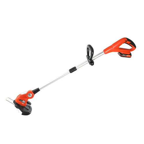 Легкий аккумуляторный триммер. Поставляется с двумя аккумуляторами и зарядным устройством. Идеально сбалансирован, используется на  участках для кошения травы. Телескопическая штанга, регулируемая D-образная  рукоятка, ограничительная скоба. Двигатель триммера можно фиксировать в 2 положениях. Комплектуется двумя (2) аккумуляторами UES 2.0 Ач и зарядным устройством GL210.