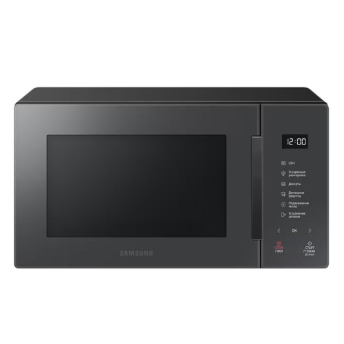 Микроволновая печь Samsung MW5000T Charcoal (MS23T5018AC) объемом 23 л оснащена дверцей с ручкой для открывания налево. Стенки камеры покрыты биокерамической эмалью, которая очищается губкой и неабразивным средством. Поворотный столик диаметром 28,8 см изготовлен из стекла. Встроенная подсветка оптимальна для наблюдения за содержимым камеры. На корпусе предусмотрена сенсорная панель с дисплеем для отображения времени и продолжительности работы. После окончания нагрева звучит сигнал. Модель мощностью 1150 Вт можно использовать для разморозки продуктов. Для быстрого нагрева используется кнопка «30 секунд».