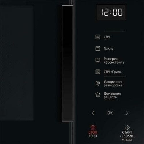 Микроволновая печь Samsung MG23T5018AK имеет объём 23 литра и оснащена мощным грилем. Контрольная панель представлена сенсорным меню. Его клавиши снабжены символьными обозначениями и надписями, поэтому у вас не возникнет проблемы с настройками. Выбирайте режим и уменьшайте или увеличивайте вес, порцию или время одним прикосновением. Устройство максимально экономично расходует ресурс электрической сети. Так, вы можете отключить дисплей с помощью клавиши «Стоп/Эко». Режим ожидания активируется автоматически через 25 минут бездействия. При оставленной открытой дверце внутреннее освещение погаснет спустя пять минут.