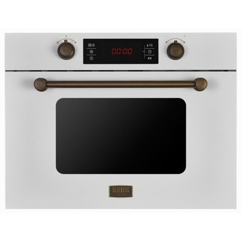 Микроволновая печь с функцией духового шкафа KMI 1082 RI — новинка из коллекции «1889», отлично гармонирует с другими встраиваемыми приборами этой ретро-серии. Цвет «античный белый», винтажная фурнитура и металлический шильд на дверце подчеркнут классический дизайн кухни. Управление осуществляется при помощи панели Touch Control и поворотных регуляторов. Модель оборудована 9 режимами нагрева. Микроволны, гриль, кольцевой нагреватель, нижний нагрев и конвекция — их сочетание дает возможность готовить блюда, как в духовке. 15 автоматических программ еще больше упрощают процесс приготовления супов, гарниров, жаркого и выпечки. Прибор оснащен функциями паузы, блокировкой от детей и тройным стеком, что делает эксплуатацию безопасной и комфортной. Ключевые преимущества: * Турбогриль * Дизайн * Функция «Защита детей»