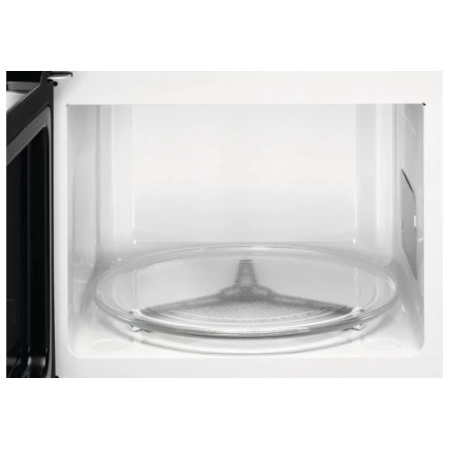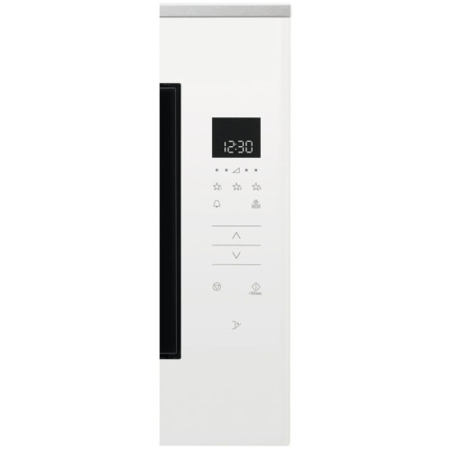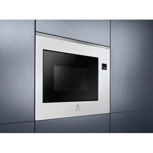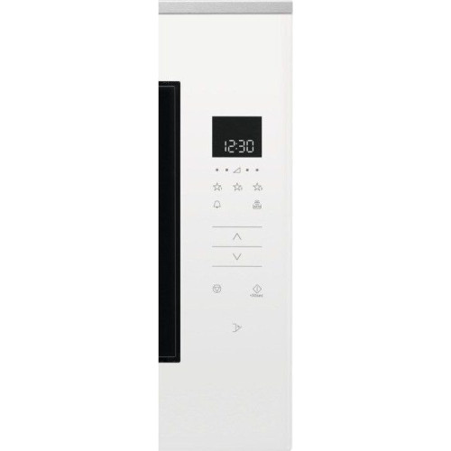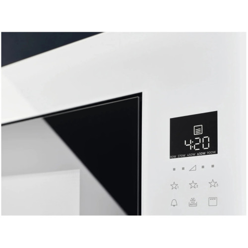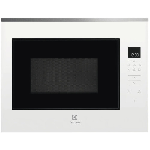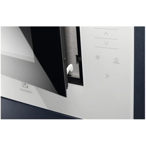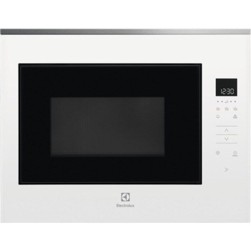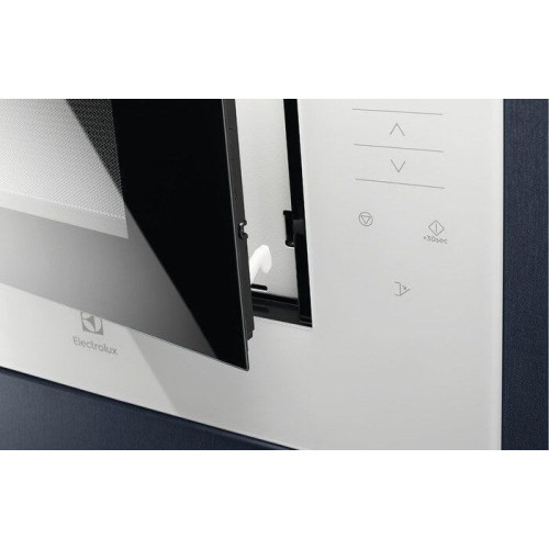 Встраиваемая микроволновая печь белого цвета с элегантным дизайном и широкими функциональными возможностями идеально впишется в любой интерьер современной кухни. Вместительная камера имеет объем 26 л, ее стенки покрыты прочной эмалированной сталью. Широкий поддон из закаленного стекла диаметром 32.5 см позволяет использовать в процессе приготовления крупную посуду. СВЧ-печь из новой коллекции Intuit, приборы данной линейки отличаются лаконичностью форм, интуитивно понятным управлением и использованием современных материалов и технологий. Навесная дверца с металлическим экраном для защиты от микроволнового излучения открывается нажатием на сенсор. Печь Electrolux оснащена очень удобным сенсорным управлением и встроенным дисплеем. Модель поддерживает 5 уровней мощности СВЧ, есть опция защитной блокировки от детей. Прибор оснащен программами автоматической разморозки и приготовления: микроволновая печь сама регулирует мощность и время воздействия микроволн в зависимости от массы и вида продукта. Мощное светодиодное освещение внутренней камеры обеспечивает визуальный контроль за процессом готовки.