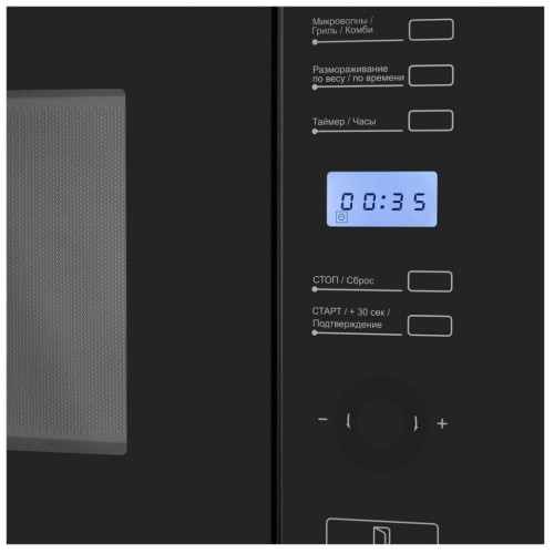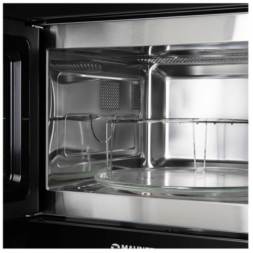 Встраиваемая микроволновая печь MAUNFELD MBMO.25.7GB оснащена стильной передней панелью немаркой черной расцветки. Оборудование действует с потребляемой мощностью 1450 Вт и способно нагревать блюда при мощности микроволн до 900 Вт. Внутренний объем печи равен 25 л, а диаметр поддона составляет 31.5 см. Печь дополнена небольшим дисплеем и удобным сенсорным управлением. Предусматривается наличие таймера до 95 минут. Гарантией безопасной эксплуатации является наличие системы блокировки от детей. Навесная дверца открывается с кнопки, а внутреннее пространство удобно подсвечивается. Поставка осуществляется с монтажным набором, поддоном с вращающимся кольцом, решеткой для гриля и инструкцией.