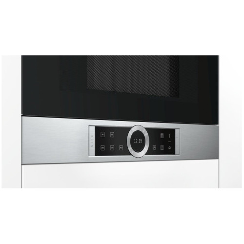 Встраиваемая микроволновая печь BFL634GB1/S1/W1 Serie 8 с сенсорным управлением и максимальной мощностью 900 Вт не только быстро разогреет блюдо, но и приготовит мясной рулет, омлет или рис. 5 уровней мощности выбираются сенсорными кнопками, а чтобы установить вес продуктов достаточно повернуть переключатель ControlRing. 7 автоматических программ все сделают за вас — только укажите вес продуктов, а время и мощность микроволновка определит сама. В модели установлено три программы разморозки и четыре приготовления блюд. Таймер приготовления устанавливается максимум на 60 минут. Размеры ниши для встраивания микроволновой печи (ВхШхГ), мм: 362-382 x 560-568 x 300.
