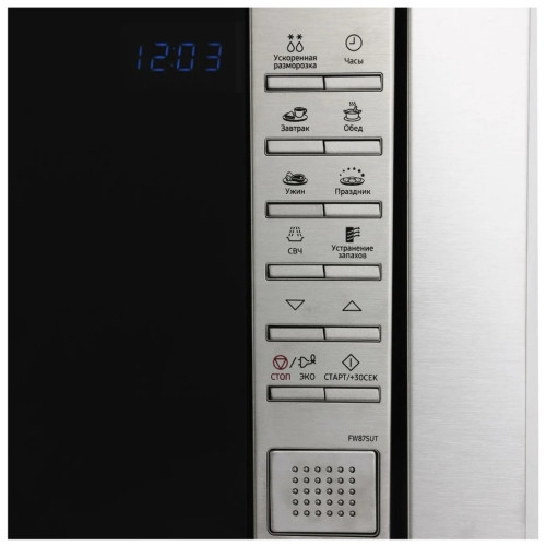 Микроволновая печь Samsung FW87SUT займет достойное место на вашей кухне благодаря стильному дизайну и современному функционалу. Оптимальный объем устройства рассчитан на 23 литра, что позволит вам разморозить или разогреть большое количество пищи. Интуитивно понятная панель управления не вызовет сложностей.