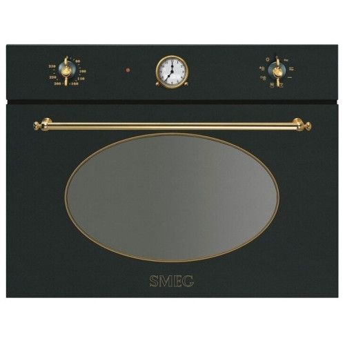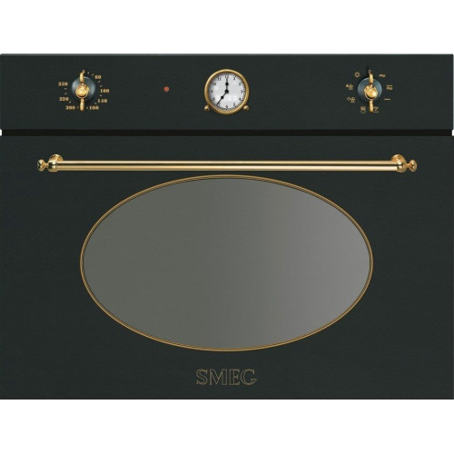 Микроволновая печь SMEG SF4800MA имеет 5 режимов и 3 уровня приготовления блюд, 4 уровня регулировки мощности, а также обеспечивает быстрый разогрев. Управляется с помощью поворачиваемых регуляторов. Высокофункциональное устройство дополнено электронным таймером с автоматическим отключением и возможностью отсрочить включение печи, а также сигналом, оповещающим о готовности блюда. При приготовлении блюда печь осуществляет контроль веса продуктов, времени приготовления и температуры. Внутренняя камера изготовлена из нержавеющей стали. Имеется откидной гриль. При открытой дверце прибор автоматически отключается. Внутренняя подсветка печи — галогенная лампа 40 Вт. В комплекте: решётка, форма для пиццы.