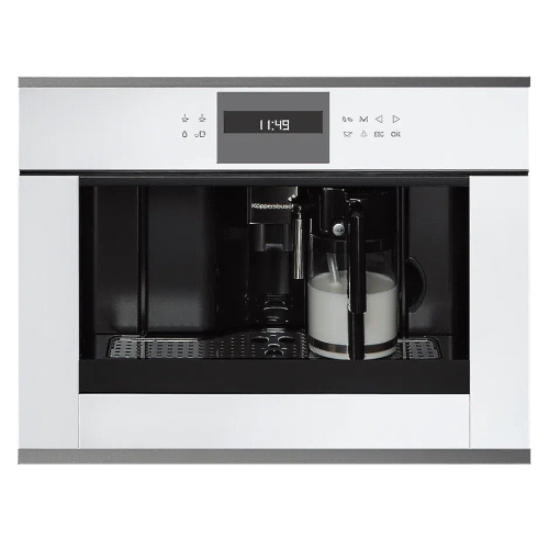 Кофемашина Kuppersbusch CKV 6550.0 ЖК-дисплей с текстовым и графическим полями Электронная система управления с сенсорными кнопками Программируемое количество кофе для 5 размеров чашек (эспрессо, малая, средняя, большая, высокая) Приготовление 1 или 2 чашек Функция подачи молока для приготовления капучино или латте Съемный контейнер для молока с функцией очистки Возможность использования кофейных зерен или молотого кофе Регулируемый по высоте раздатчик кофе Давление при заваривании ≈ 15 бар 3 температуры кофе на выбор Возможность выбора крепости кофе (5 предварительно заданных уровней) Отдельные нагреватели для заваривания кофе и приготовления горячей воды Программа удаления накипи Автоматическое ополаскивание при включении и отключении Емкость для воды заполняется спереди Электронный таймер с белыми индикаторами Программируемое время включения Режим ожидания Телескопические направляющие для легкого заполнения кофемашины Подсветка чашек Наблюдение доставляет удовольствие - хорошо известный факт. Светодиодная подсветка преподносит только что сваренный кофе в правильном свете. И приготовление кофе становится хорошей традицией Емкость для свежей воды Духовые шкафы и кофемашины Kuppersbusch легко встраиваются в любую кухонную мебель, так как благодаря наличию емкости для свежей воды подсоединение к водопроводу не требуются Характеристики: Потребляемая мощность: 1,35 кВт (вилка Schuko) Размеры прибора (Ш x В x Г): ≈ 595 x 455 x 475 мм (вкл. фасад 20 мм и телескопические направляющие) Размеры ниши (Ш x В x Г): ≈ 560 x 450 x 550 мм