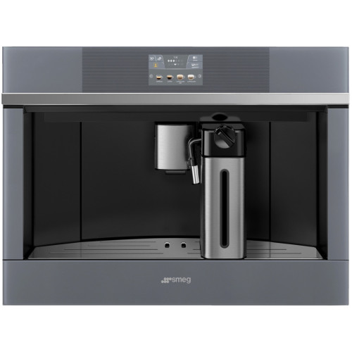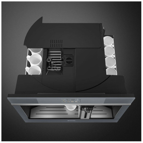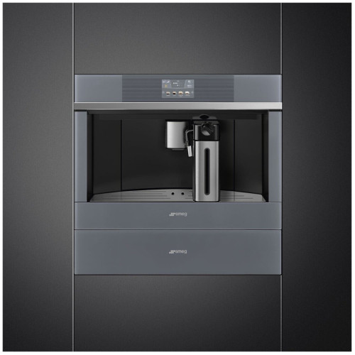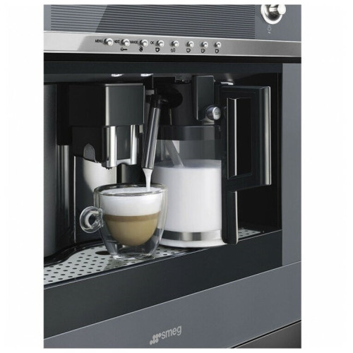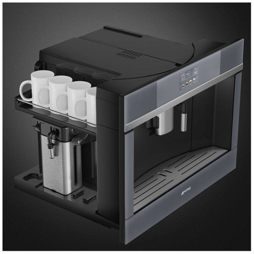 SMEG CMS4104N – встраиваемая кофемашина, которая идеально впишется в интерьер вашей кухни. Модель займёт минимум пространства и при этом будет радовать вас разнообразным функционалом. Для управления всеми узлами устройства предусмотрено сенсорное меню с крупными наглядными символами. Так, для того чтобы выбрать объём порции и крепость, достаточно пары прикосновений к отзывчивым клавишам. Если вас не устраивает, что бодрящий напиток быстро остывает, то вам наверняка пригодится простой лайфхак, а именно – предварительный подогрев чашек. Для этого в конструкции машины предусмотрена эргономичная подставка. Благодаря возможности регулировки носика вы одинаково аккуратно наполните и высокие, и низкие кружки. Заблокируйте панель управления – так дети точно не собьют выставленные вами настройки. SMEG CMS4104N с функцией Stand-by отключится спустя час бездействия, что позволит оптимизировать потребление электроэнергии.