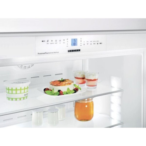 Liebherr ECBN 6156 Общие данные: Габариты: 202.7х91х61 см Габариты ниши для встраивания: 203.2х91.5х62.5 см Общий полезный объем: 480 л Полезный объем холодильной камеры: 295 л Полезный объем морозильной камеры: 116 л Полезный объем зоны свежести: 69 л Класс энергопотребления: A+ Климатический класс: SN-T Количество компрессоров: 2 Годовое потребление энергии: 434 квтч/год Цвет: белый Холодильное отделение: 4 полки из стекла, 3 из них регулируемые и 1 секционная 6 полочек на дверце Зона свежести BioFresh (БиоФреш) Внутреннее освещение камеры BioFresh: светодиодное Контейнеры BioFresh (БиоФреш) на телескопических направляющих: 2 Отсек DrySafe - с низкой влажностью для рыбы, мяса и молочных продуктов Отсек HydroSafe - с регулируемой влажностью для овощей и фруктов Автоматическое размораживание Освещение: светодиодная осветительная колонна и светодиодное потолочное освещение SuperCool Отсек для яиц Вентилятор Морозильное отделение: Система No Frost (Frost Free, Ноу Фрост) Время сохранения холода при отключении электроэнергии: 21 ч* Мощность замораживания: 11 кг/сутки Внутреннее освещение: светодиодное SuperFrost с автоматическим отключением Выдвижные ящики: 2 Система FrostSafe с закрытыми со всех сторон белыми выдвижными ящиками Ледогенератор с постоянным подключением воды Объем ледяных кубиков: 1.3 кг/сутки Макс. запас кубиков льда: 2.7 кг Дополнительная информация: Регулируемые контуры охлаждения: 2 Цифровая индикация температуры в MagicEye Обслуживание системы управления: Touch-Elektronic Индикатор температуры холодильной камеры: внутри цифровой Индикатор температуры морозильной камеры: внутри цифровой Температура в морозильной камере регулируется независимо от температуры в холодильной камере Дверь открыта: Предупредительный сигнал морозильной камеры - акустический Неисправность: Предупредительный сигнал - оптический и акустический Регулировочные ножки: 2 Уровень шума: 42 дБ Жесткое крепление двери Угол открывания двери: 115° Коротко о товаре 91.5x62.5x203.2 см трехкамерный класс A+ морозильник снизу зона свежести общий объем 471 л капельная система разморозки