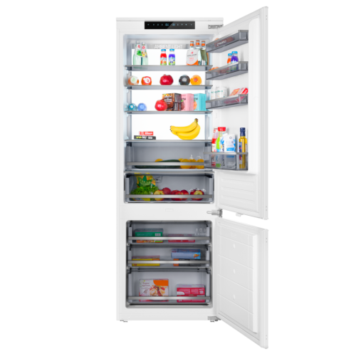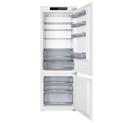 Особенности Еще больше пространства Храните больше продуктов в дверных карманах, не тратя пространство внутри полок. Широкие и глубокие дверные карманы позволят безопасно хранить больше бутылок, картонных пакетов и других объектов в постоянном доступе без необходимости брать их с полки. Подсветка Ambient Lighting : яркое и равномерное освещение пространства холодильника. Светодиодная подсветка привносит в холодильник совершенно новую концепцию, гарантируя равномерное освещение всего пространства без бликов. Светодиодные лампы потребляют меньше электроэнергии, чем обычные лампы накаливания, и служат в течение всего срока службы прибора. Полноценная мобильность в области морозильной камеры. Вы можете легко убрать все полки из безопасного стекла в морозильной камере, чтобы создать больше места - например, для хранения многоуровневого пирога или целой индейки. Крупные продукты, такие как пицца семейного размера, можно без проблем укладывать на стеклянные поверхности. Предупреждающий сигнал со звуком или светом, когда дверь не закрыта или при возникновении другой ошибки. Total NoFrost. Забудьте про разморозку холодильника. Постоянная циркуляция сухого холодного воздуха препятствует образованию льда на задней стенке, в ящиках и в морозильном отделении. С холодильником Total NoFrost о разморозке можно забыть. Контроль над функциями холодильника обеспечивает понятная и простая сенсорная панель управления. Температурный режим настраивается индивидуально для каждой из камер. Зона свежести создаёт все условия, чтобы содержимое холодильника как можно дольше оставалось свежим. В зоне для хранения мяса и рыбы с регулируемой температурой от -3 °C до +3 °C Полки оснащены стильными металлическими фреймами . Это не только декоративный элемент, придающий холодильнику современный вид: фреймы защищают от трещин и сколов, а также препятствуют стеканию жидкостей в случае их пролития. Режим «Отпуск» помогает перевести работу устройства в экономичный режим. Вы можете существенно снизить расход электроэнергии, когда нет необходимости в использовании холодильника. Быстрое охлаждение и заморозка Воспользуйтесь опцией быстрого охлаждения, которая помогает быстрее охладить любые продукты. Быстрая заморозка за счет интенсивного потока холодного воздуха позволяет быстрее производить лед и осуществлять глубокую заморозку. Режим быстрой заморозки способствует сохранению свежести и витаминов в продуктах, хранящихся в морозильной камере. Тихая работа Уровень шума всего 41 дБ – современный компрессор не только экономит электроэнергию, но и тихо работает. Чтобы ничего не нарушало вашего спокойствия. Режим «Экономичный» — температура в холодильном отделении будет установлена на 5°C, в морозильном отделении на -18°C. Это сохранит холодильник в рабочем состоянии, но при этом снизит уровень энергопотребления, в отсеке Fresh Zone – на 3°С. В верхней холодильной камере находятся: 5 стеклянных полок , 1 выдвижной ящика для фруктов и овощей 1 выдвижной ящика для рыбы и мяса 4 боковые полки на дверце подставка для яиц В нижней морозильной камере: 3 выдвижных ящика 2 полки форма для льда.