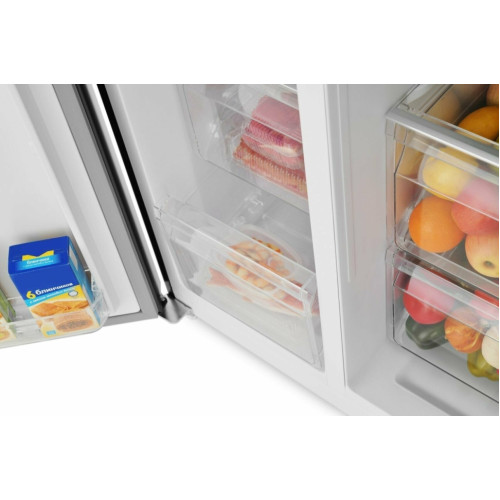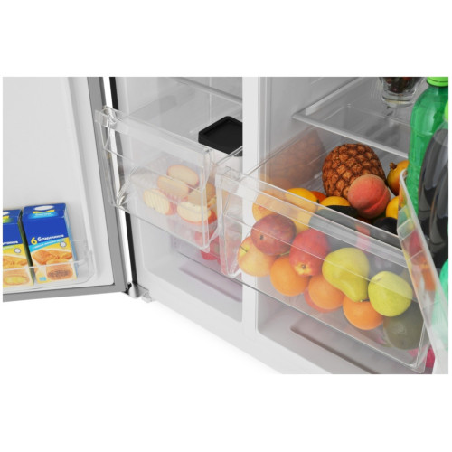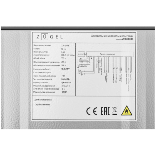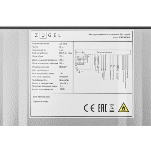 Двухдверный холодильник-морозильник ZUGEL Side-by-Side ZRSS630 предназначен для хранения, охлаждения и замораживания большого объема продуктов. Эта современная модель оснащена передовой технологией Full No Frost и инверторным компрессором. Грамотно организованное внутреннее пространство позволяет удобно и комфортно использовать прибор. Модель представлена в 3х дизайнах: фасады из нержавеющей и черной брашированной стали, а так же из закаленного белого стекла. Объем холодильной камеры 359л дает Вам полную уверенность, что Вы сможете разместить все необходимые продукты. А особая эргономика внутренних полок позволит оптимизировать внутреннее пространство камеры, в случае необходимости. Объем морозильной камеры 200л обеспечит гарантию того, что данная модель предоставит Вам достаточно места для заморозки и хранения продуктов. Класс энергопотребления А++ позволит Вам убедиться, что техника ZUGEL создает по-настоящему эффективные устройства, не расходующие при этом больше электричества, чем это необходимо. Система Leco – Равномерное распределение воздушных потоков по холодильному отделению и точное поддержание оптимальной температуры для хранения продуктов. Режим Smart (Интеллектуальный) - автоматический режим для наилучшего сохранения свежести продуктов и экономного расхода электроэнергии. LED-дисплей. Благодаря LED-дисплею и управлению на дверце, можно не открывать холодильник для смены настроек. Внутрь не попадает тёплый воздух — лучше сохранность продуктов и меньше расход электроэнергии. Внутреннее LED освещение. Светодиоды — это современное решение для освещения: ярче светят, дольше работают и гораздо экономичней ламп накаливания. Полки из закаленного стекла – надежность и эстетичный внешний вид. Функция Power-Off Memory - сохранит настройки при отключении электричества. Вам больше не придется заново вводить предыдущие параметры при скачках электроэнергии. Функция Power-On Delay - задержка включения компрессора после сбоя питания менее 5 минут для его защиты от повреждения Инверторный компрессор способствует более точному поддержанию температуры в холодильнике. Другие плюсы инверторной технологии: улучшенная энергоэффективность, тихая работа и увеличенный рабочий ресурс.