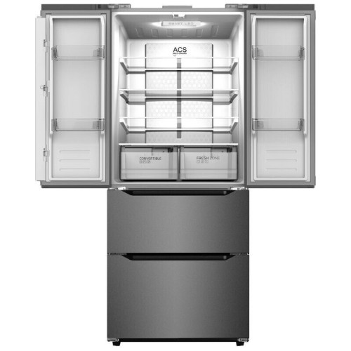 Холодильник MDC-637ID незаменимый помощник на кухне с электронным управлением представлен в тёмном металлическом цвете и является мощным и вместительным холодильным агрегатом с функцией замораживания. Для хранения в нем продуктов предусмотрены камеры с распашными дверями для холодильного отделения и 2 выдвижных ящика для морозильного. Модель совмещает в себе стильный дизайн, отличные технические характеристики и высокие эксплуатационные качества. Общий объём составляем 436 литров. В холодильном отделении пространство разделено четырьмя полками и двумя ящиками для хранения овощей, зелени и фруктов, один из которых можно регулировать по температуре индивидуально с помощью панели управления над ним. На дверцах холодильного отделения также предусмотрено четыре полки для хранения продуктов. В комплектации холодильника имеется 2 лотка для яиц. В верхнем ящике морозильного отделения есть выдвижная полка, в нижнем разделитель пространства. Функции Суперохлаждение и Суперзаморозка позволят быстро опустить температуру до минимальных значений в каждой камере. Данная модель оснащена инверторным компрессором, что обеспечивает улучшенную производительность, пониженное энергопотребление и низкий уровень шума! Система размораживания Total NoFrost исключает потребность в ручной разморозке, соответственно, уход за холодильником WILLMARK MDC-637ID будет максимально простым. Увеличенный гарантийный срок на инверторный компрессор составляет 10 лет, а общий гарантийный срок составляет 3 года со дня покупки! Основной цвет Dark Inox Размораживание морозильной камеры / НТО NoFrost Размораживание холодильной камеры NoFrost Температура холодильной камеры, °C (+2) – (+8) Температура морозильной камеры, °C (-15) – (-25) Уровень шума, дБА 40 Хладагент, гр. R600a/72 Подставка для яиц Есть Форма для льда Есть Общий объем, л. 436 Общий полезный объем, л. 424 Полезный объем холодильной камеры 282 Полезный объем морозильной камеры / НТО 142 Количество камер 2 Количество дверей 4 Перенавешиваемые двери Нет Стеклянные панели Нет Нулевой зазор дверцы Нет Расположение морозильной камеры / НТО Снизу Материал полок Стекло Полки в холодильной камере 4 Ящики в холодильной камере 2 Ящики/открытые полки в морозильной камере/НТО 2 ящика Полки на дверце в холодильной камере 4 Полки на дверце в морозильной камере Нет Дисплей Есть Вид дисплея Внешний Тип управления Сенсорный Индикация температуры Есть Инверторный компрессор Есть DualInverter Есть Количество компрессоров 1 Дополнительно Многопоточная система охлаждения, режимы суперохлаждение, суперзаморозка, Smart, отпуск. Регулировка температуры в ящике “Зоны свежести”. Напряжение питания, В/Гц 230/50 Энергопотребление, кВтч/год 280 Класс энергопотребления А++ Климатические классы SN/N/ST/T Габариты изделия Ширина*Глубина*Высота 753*678*1846 Габариты в упаковке Ширина*Глубина*Высота 840*750*1906 Вес 84 Вес в упаковке 94 Гарантия 3 года на изделе, 10 лет на компрессор Длина сетевого кабеля, см. 150