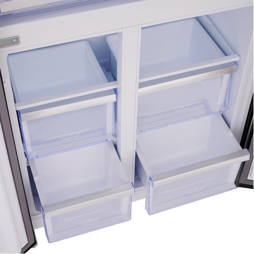 Серия Intelligence от Tesler – это надёжная и практичная техника для современной кухни . Холодильник RCD-482I с общим полезным объёмом в 417 л. позволит забыть про нехватку пространства для размещения продуктов, а широкий функционал модели поможет сохранить их свежесть надолго. Полезный объем холодильной камеры - 288 литров, а морозильной - 129. Благодаря системе распашных дверей CROSS DOOR вы можете легко получить непосредственный доступ к содержимому в любом месте, будь то полка в холодильной камере или ящик морозильного отделения. Чтобы достать нужный продукт достаточно открыть лишь одну дверцу. Это значит, что уплотнение дверей прослужит дольше, а из наполовину приоткрытой холодильной камеры меньше уходит холод, соответственно, вы экономите электроэнергию. Модель предлагает гибкие решения для оптимизации пространства внутри. Вы можете убрать некоторые полки, чтобы увеличить объем хранения и уменьшить энергопотребление. Благодаря технологии NoFrost лёд не намерзает внутри камер, там поддерживается оптимальный для хранения продуктов микроклимат без образования инея. Благодаря продуманной системе вентиляции продукты не заветриваются и сохраняют свой аромат. У вас всегда будет достаточно места для длительного хранения продуктов и заморозки заготовок на зиму. Морозильное отделение имеет 2 дверцы, а значит происходит меньше потерь холода при открывании лишь одной дверцы. В отсеке 4 ящика и 1 широкая полка для удобства сортировки продуктов. Встроенная LED-подсветка всегда поможет найти нужный продукт без существенного расхода электроэнергии. LED дисплей поможет настроить нужные параметры для каждой из камер по отдельности, либо активировать автоматические режимы. B случае необходимости панель управления можно заблокировать. Холодильники Intelligence оборудованы инверторными компрессорами, которые гарантируют постоянство температуры и влажности внутри камер. Компрессоры такого типа работают тихо и потребляют меньше электроэнергии. В холодильниках Tesler компрессор оснащен функцией защиты, благодаря чему обеспечивается долгий срок его службы. Добавить в корзину