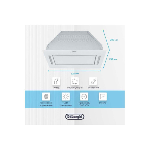 Описание Полностью встраиваемая кухонная вытяжка DeLonghi COSETTA 515 BB – надежное решение по устранению запахов на вашей кухне. Вытяжка умеет работать в двух режимах: Отвод - выведение воздуха при помощи вентиляционной системы. Рециркуляция - очистка воздуха внутри вытяжки, не требует подключения к вентиляции. Сенсорное управление - удобство при использовании и уход за вытяжкой без усилий за счёт отсутствия выступающих элементов. 3 скорости - управляйте мощностью работы вытяжки. Повышенная производительность 1500 м³/ч – гарантия качественной очистки воздуха. Освещение - долговечная светодиодная лампа с приятным светом позволяет не включать основной свет на кухне при приготовлении пищи. Белый цвет, стекло - стильный выбор для вашего интерьера. Преимущества DeLonghi COSETTA 515 2 режима работы: отвод и рециркуляция Сенсорное управление Повышенная производительность - 1500 м³/ч 3 скорости - управляйте мощностью работы вытяжки Долговечная светодиодная лампа с приятным светом Стильный дизайн