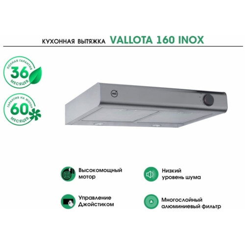 Красивая подвесная кухонная вытяжка VALLOTA 160 INOX проста в управлении и надежна в действии. Мощный мотор быстро и нешумно очистит вашу кухню от лишних запахов как в режиме рециркуляции, так и в режиме воздухоотведения. Дизайн и размеры этой модели позволяют вписать ее на кухню любого современного стиля и размера.Вытяжка VALLOTA 160 INOX исполнена в цвете металлик, имеет три режима, а управляется она удобным джойстиком. При желании ее поверхность также можно использовать как декоративную полочку.Вся кухонная техника бренда MBS соответствует всем современным европейским стандартам.