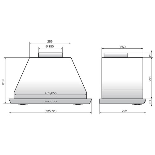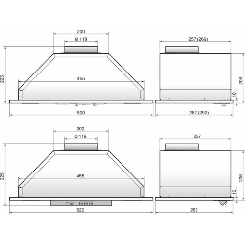 полновстраиваемая кухонная вытяжка встраивается в навесной шкафчик отвод / циркуляция Макс. производительность 1000 куб. м/ч ширина для установки 45.8 см мощность 225 Вт электронное управление тихий двигатель