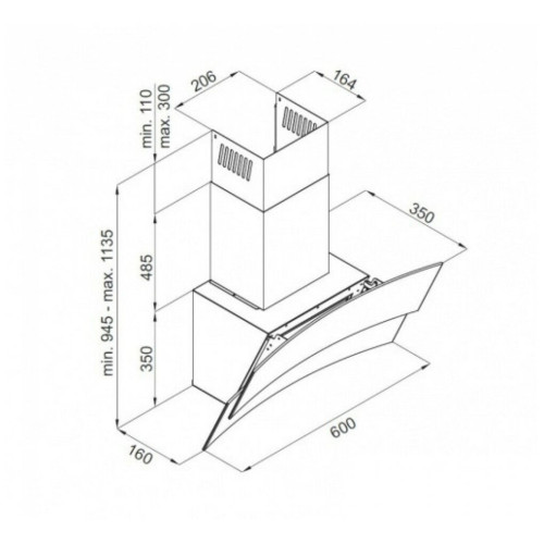 Установка: каминная пристенная; Тип вытяжки: наклонная; Количество двигателей: 1; Материал корпуса: металл, стекло; Ширина встраивания: 60 см; Диаметр патрубка воздуховода: 150 мм; Размеры (ВхШхГ): 113.50х60х35 см; Количество скоростей: 3; Управление: электронное, сенсорное; Освещение: галогенная лампа, 20 Вт х 2; Периметриальное всасывание: есть; Максимальная производительность: 720 куб. м/ч; Режимы работы: отвод и циркуляция; Фильтр: жировой; Антивозвратный клапан: