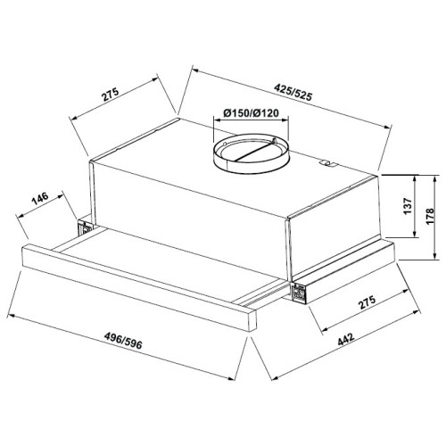 Встраиваемая кухонная вытяжка SLIMLUX IV 50 обеспечит неплохую производительность в помещении небольшой площадью. С таким прибором можно запустить функцию стабильной и качественной рециркуляции воздуха. Этот элегантный и в то же время функциональный прибор с выдвижным механизмом способен достаточно быстро нейтрализовать все неприятные ароматы, вредные испарения, дым и копоть, нередко образующиеся при пригорании еды. Оцените полезные свойства данной модели: - качественная рециркуляция и быстрое отведение воздуха; - мощность 550 м3/ч; - 3 цикла переключений скорости; - фильтр из металла, надежно нейтрализующий жировые соединения; - механическое управление на кнопках; - средний уровень шума (61 Дб); - светодиодное освещение рабочей поверхности. ВЫДВИЖНАЯ ВЫТЯЖКА Компактность пока вы не эксплуатируете вытяжку и покрытие большой площади всасывания воздуха во время работы, обеспечивается за счет выдвижной конструкции.