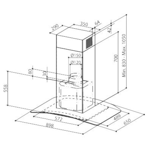 Общие данные: Производительность: 300/480/620/700 куб. м/час Мощность: 145/180/230/250 Вт Давление: 330/430/480/500 Па Уровень шума без silent kit: 54/64/69/71 дБ Ширина: 90 см Высота: 83 см Глубина: 65 см Алюминиевый фильтр Управление: 4 скорости Тип управления вытяжки: кнопочный Дополнительная информация: Цвет: нержавеющая сталь Монтаж: к потолку