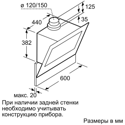 Вытяжка предназначена для настенного монтажа над варочной поверхностью. Может работать в режиме отвода или циркуляции воздуха (для работы в режиме циркуляции требуется установка специального комплекта). Прибор с электронным управлением оснащён 7-сегментным дисплеем. Имеет 3 ступени мощности и ступень интенсивного режима. Может автоматически отключать интенсивный режим работы. Вытяжка снабжена металлическим жироулавливающим фильтром, который можно мыть в посудомоечной машине. Предусмотрена индикация насыщения фильтров. Крышка фильтра выполнена из стекла.