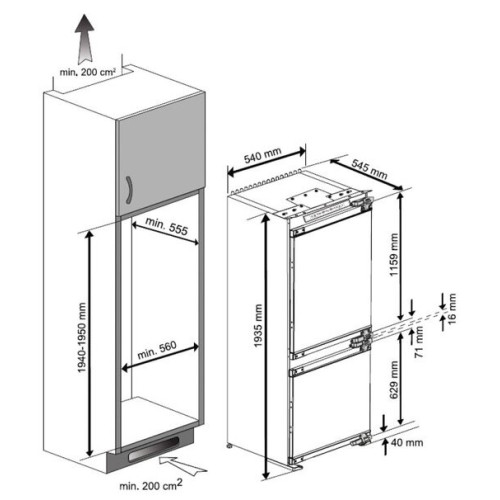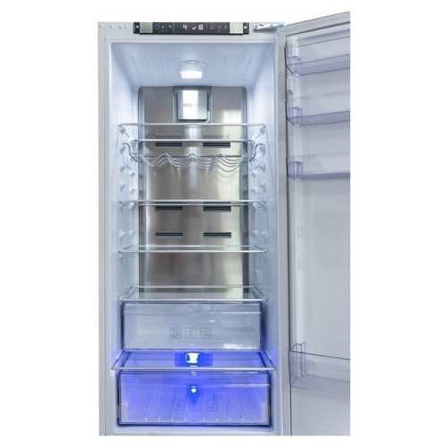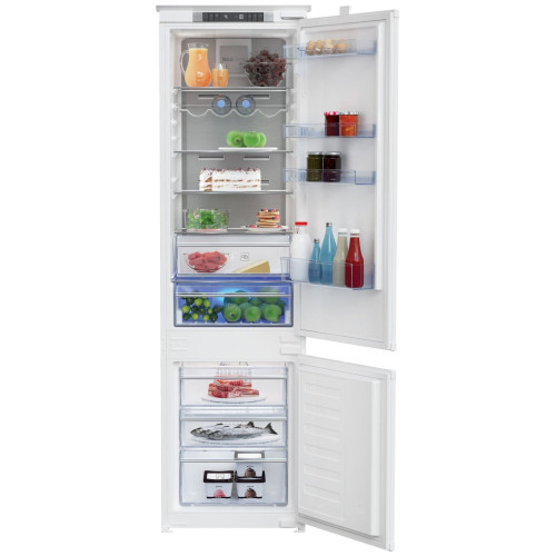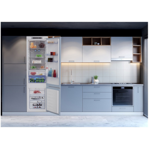 Встраиваемый двухкамерный холодильник с системой охлаждения NoFrost (Ноу Фрост) не требует разморозки и имеет удобное электронное управление. Вместительная холодильная камера оснащена 4 полками и двумя ящиками для хранения продуктов, 4 дверными полками, подставкой для яиц и хромированной полкой для бутылок. Зона свежести 0?C в холодильнике Beko предназначена для более длительного хранения свежего мяса, рыбы и сыра. Специальный ящик с голубой подсветкой BlueLight позволяет дольше сохранить фрукты и овощи свежими и полезными.