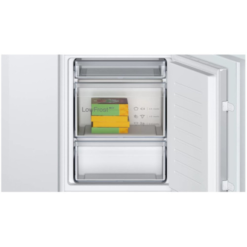 Двухкамерный холодильник Bosch KIV 865 SF0 - встраиваемая модель с ящиком для овощей и фруктов MultiBox. Благодаря циркуляции EcoAirflow поддерживается постоянная температура по всей холодильной камере. Система охлаждения LowFrost уменьшает обледенение морозильной камеры, излишняя влага отводится наружу через специальное отверстие. Ключевые преимущества LowFrost Светодиодное освещение Ящик MultiBox Бренд Bosch Цвет белый Расположение морозильной камеры снизу Общий объем (л) 267 Объем холодильной камеры (л) 183 Объем морозильной камеры (л) 183 Размораживание холодильной камеры No Frost Размораживание морозильной камеры No Frost Управление электронное Уровень шума (дБ) 39 Автономное сохранение холода (ч) 9 Мощность замораживания (кг/cутки) 4.2 Количество компрессоров 1 Энергопотребление (кВтч/год) 286 Климатический класс ST,SN,T Высота (см) 177.2 Ширина (см) 54.1 Глубина (см) 54.8 Вес (кг) 51