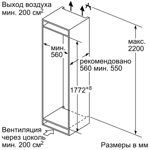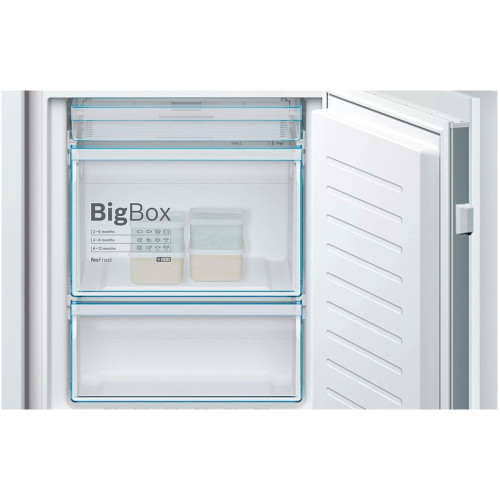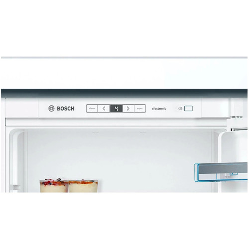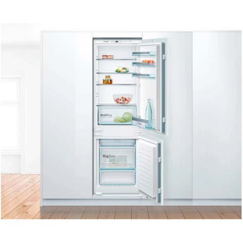 Встраиваемый холодильник BOSCH KIN86VS20R - это немецкая надежность, богатый функционал и лаконичный дизайн. Данная модель оснащена зоной свежести MultiBox, которая продлевает срок хранения овощей и фруктов. В морозильной камере холодильника есть функция SuperFreezing, обеспечивающая быстрое замораживание новых продуктов. Разморозка BOSCH KIN86VS20R не потребует вашего активного вмешательства. Холодильное отделение размораживается капельным способом, а в морозильной камере реализована технология No Frost. Для хранения продуктов большого размера (например, индейки) в морозильной камере есть контейнер увеличенного размера BigBox (высота 29 см). Габариты (ШxГxВ) 54x54x177 см Количество дверей 2 Количество камер 2 Количество компрессоров 1 Морозильная камера снизу Расположение встраиваемый Тип холодильник Управление электронное Хладагент R600a (изобутан) Цвет / Материал покрытия белый / металл Энергопотребление класс A+ (222 кВтч/год) Автономное сохранение холода до 13 ч Дополнительные возможности суперзаморозка, индикация температуры Индикация открытой двери – звуковая Мощность замораживания до 8 кг/cутки Размораживание морозильной камеры No Frost Размораживание холодильной камеры капельная система Общий объем 255 л Объем морозильной камеры 67 л Объем холодильной камеры 188 л Возможность перевешивания двери есть Генератор льда отсутствует Климатический класс SN, ST Материал полок стекло Особенности внутренний дисплей Срок гарантии 1 год