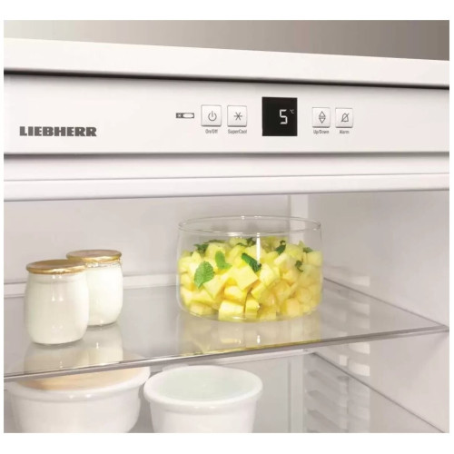 Встраиваемая модель габаритами 82-88×60×55 см позволяет гармонично вписать её в любой интерьер. Эргономичная конструкция корпуса и современные технологии, своевременно внедряемые в производство, гарантируют удобство и длительный срок эксплуатации. Дверной упор предусмотрен справа, однако присутствует возможность перевешивания на левую сторону. Монтируется дверца жёстким креплением Doorondoor и открывается максимум на 115º. Холодильный отсек примечателен вместимостью 136 л. Полезный объём помогают рационально распределить четыре полки из высокотехнологичного закалённого стекла. Три из них могут быть установлены вариабельным образом или убраны для размещения продуктов больших размеров или сложной конфигурации. Отделение под стационарной представляет собой контейнер для фруктов и овощей, а также зелени. Нижняя полочка на двери обладает ограничителем для хранения бутылок, верхняя же отлично подойдёт для масла, сыра и другой продукции. Электронная панель управления оснащена ЖК-дисплеем с индикацией поддерживаемой в камере температуры. С помощью кнопок температурный режим можно отрегулировать. Освещение осуществляется посредством экономичной светодиодной потолочной лампы. Функция Super Cool предназначена для быстрого равномерного охлаждения помещённых в устройство блюд с сохранением их вкусовых свойств, а также витаминов и микроэлементов. Световой и звуковой сигнал предотвратят оставление прибора в открытом состоянии более 60 секунд. Класс энергоэффективности А++ обеспечивает Либхер UIK 1510 Comfort высокие показатели при низких затратах электроэнергии. Ключевые особенности: Датчик открытой дверцы Система door on door Цокольная панель Vario