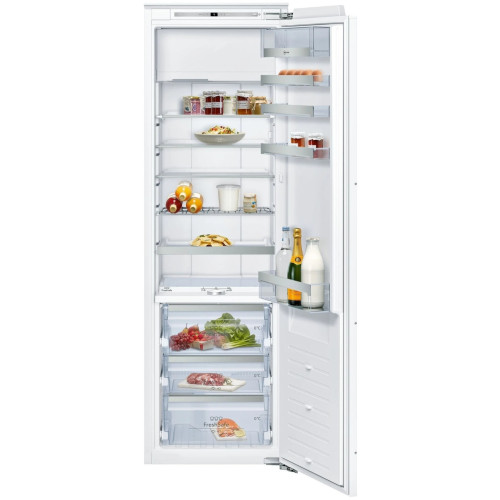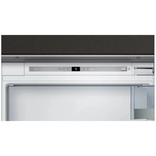 Встраиваемая холодильно-морозильная комбинация Neff KI8825D20R имеет обширный функционал. Модель, выполненная в Германии, представлена в белом цвете, поэтому подойдет к любому интерьеру кухни. Такой дизайн считается классическим и универсальным. Техника обладает габаритными размерами 177.2×55.8×54.5 см и будет удобна для встраивания. Она обладает общим полезным объемом в 269 л, из которых 254 л — объем холодильной камеры, а 15 л — морозильной камеры. С данным товаром все продукты поместятся, и вы больше не будете переживать, что не хватит места. Устанавливать температуру и контролировать ее уровень, включать и менять режимы, не открывая дверцу, позволяет электронный тип управления. Благодаря дисплею на дверце Вы можете в графическом и цифровом виде видеть информацию и менять настройки. Интерфейс будет понятен каждому. Если Вы случайно забыли закрыть дверцу, то сработает звуковой сигнал. Это обеспечивает безопасность эксплуатации. В морозильном отделении холодильника снижена влажность, а значит, лишняя вода не будет оседать на стенках камеры и превращаться в наледь. Вам будет доступна система «Суперохлаждение» — это функция, которая позволяет в короткий срок охладить продукты за счет принудительного и резкого понижения температуры в холодильной камере. Встраиваемая холодильно-морозильная комбинация Нефф KI8825D20R работает очень тихо: громкость издаваемых им звуков не превышает 37 дБ, поэтому его работу вы даже не будете слышать на кухне за разговором. Зона свежести предназначена для длительного хранения скоропортящихся продуктов. В этом отсеке поддерживается температура, близкая к нулю. Также обе камеры оснащены LED-лампами, которые ярко и равномерно подсвечивают внутреннее пространство.
