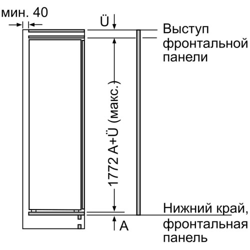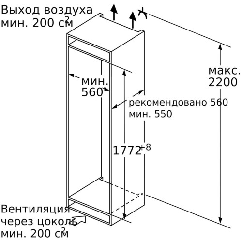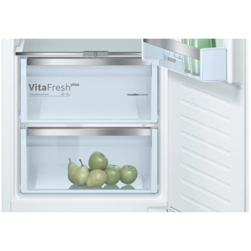 Встраиваемый однокамерный холодильник Bosch KIR 81AF20R — вместительная модель с зоной свежести и продуманным внутренним наполнением. Герметичный контейнер VitaFresh plus Box позволяет дольше сохранять фрукты и овощи свежими. Благодаря телескопическим полозьям выдвигать ящик легко, даже если он полностью загружен. Электронный контроль температуры и система VitaControl гарантирует поддержание постоянного уровня холода, что обеспечивает длительное хранение. Разделяющиеся полки VarioShelf созданы для размещения высоких упаковок и посуды. Полки из закаленного стекла EasyAccess удобно выдвигать и задвигать, чтобы уложить продукты. Ключевые преимущества: Герметичная зона свежести VitaFresh plus Box Система полок VarioShelf и EasyAccess Автоматический режим суперохлаждения Тип встраиваемый холодильник Цвет белый Материал покрытия пластик/металл Управление электронное Класс энергопотребления F Количество компрессоров 1 компрессор Количество камер 1 камера Количество дверей 1 дверь Габариты (ВхШхГ) 177.2х55.8х54.5 см Размораживание холодильной камеры капельная система Индикация открытой двери звуковая Сигнализация об ошибке звуковая Общий объем 319 л Зона свежести VitaFresh plus Материал полок стекло Возможность перевешивания двери есть Уровень шума 37 дБ Климатический класс N, SN, ST, T Функция суперохлаждения есть Общее количество полок в холодильной камере 7 полок Количество полок на дверце 6 полок Годовой расход эл.энергии 116 кВтч Мощность подключения 90 Вт Габариты ниши (ВхШхГ) 177.5х56х55 см Вес 67 кг Длина сетевого кабеля 2.3 м Срок гарантии 1 год