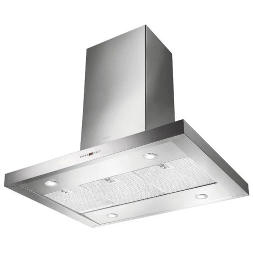 Каминная островная вытяжка с корпусом, выполненным из нержавеющей стали. Ширина вытяжки равна 90 см, производительность - 1100 куб.м/час. Максимальный уровень шума, производимого вытяжкой, составляет 52 дБ.
