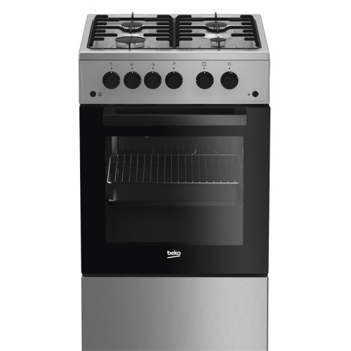 Отдельностоящая газовая плита цвета нержавеющей стали имеет ширину 50 см и 4 конфорки с легкими эмалированными решетками. Газовая духовка имеет режим гриля, а максимальная температура внутри может достигать 300 °С. Плита оснащена кнопкой электроподжига газовых конфорок и духового шкафа и системой газ-контроля, которая прекращает подачу газа, если пламя случайно погаснет. В комплектацию газовой плиты входят стандартный эмалированный противень, решетка и щиток для гриля.