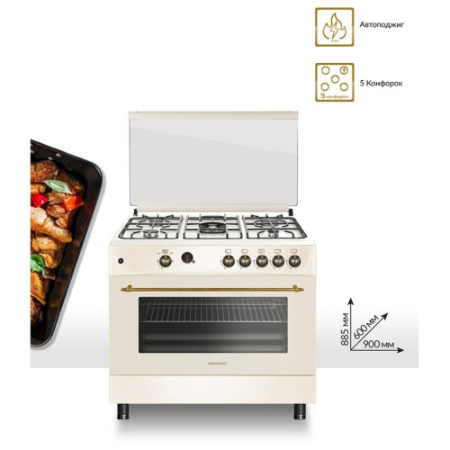 тип: газовая, тип духовки: газовая, тип варочной панели: газовая, материал рабочей поверхности: эмалированная сталь, ширина: 90 см, глубина: 60 см, количество конфорок: 5, электроподжиг: варочная поверхность, газ-контроль: конфорок, гриль