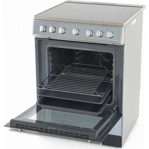 Электрическая плита HC 62010 R Moire оснащена стеклокерамической варочной поверхностью и мультифункциональной духовкой. Девять режимов нагрева позволяют приготовить любое блюдо. Вместительный посудный ящик экономит пространство на кухне, два удобных противня и решетка — в комплекте. Ключевые преимущества: * Конвекция * Легкоочищающаяся эмаль * Съемная дверца духовки