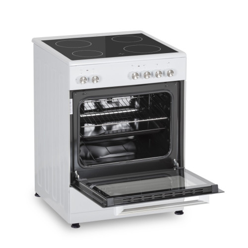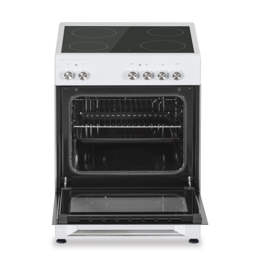 • Цвет: белый, переключатели декорированные нержавеющей сталью Поверхность: • Стеклокерамическая варочная поверхность • 4 стеклокерамические конфорки (2x1200Вт., 2x1700Вт.) Комфорка 1. 12 см Комфорка 2. 12 см Комфорка 3. 17 см Комфорка 4. 17 см Духовой шкаф: • Электрическая духовка, • 3 режимов работы (нижний и верхний нагревательные элементы) • Полезный объем 58л. • Эмаль легкой очистки “Easy Clean” • 2ое остекление дверцы “Cool touch” • Механический звуковой таймер • Подсветка духовки Комплектация: - 1 стандартный противень - 1 хромированная решётка - откидной ящик для посуды