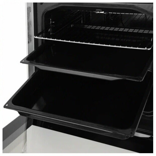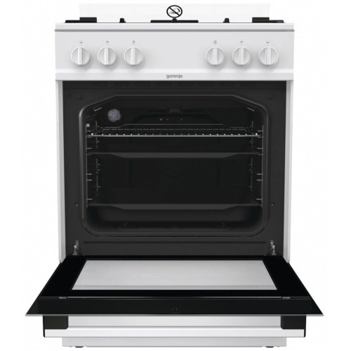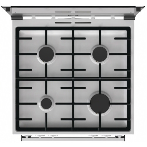 Ширина газовой плиты Gorenje составляет 60 см. Она оснащена четырьмя конфорками: малой мощностью 1000 Вт, двумя средними по 1900 Вт и 3000-ваттной увеличенной. Духовой шкаф объемом 64 л имеет сводчатую форму (технология HomeMade). Она создает условия, сходные с теми, что возникают в дровяной печи: обеспечивается нагрев со всех сторон и равномерность приготовления. И горелки, и духовка снабжены автоматическим электроподжигом: пламя вызывается поворотом регулятора. За безопасность отвечает система «Газ-контроль». Опорой для посуды служит чугунная решетка, а для противней — металлические направляющие. Стенки духовки покрыты фирменной эмалью SilverMatte — непористым гладким материалом. За очистку отвечает функция AquaClean: загрязнения размягчаются горячим паром, после чего удалить их салфеткой не составит труда. Дверца оборудована двойным стеклопакетом — снаружи плита не нагревается.
