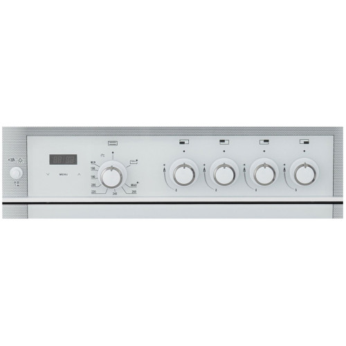 Фасад и защитная крышка рабочей поверхности - стеклянные. Модель оснащена составными чугунными решетками и доводчиком дверцы для плавного открытия - закрытия. Все газовые горелки оснащены газ-контролем, а электроподжиг - автоматический и встроен в поворотные ручки. Духовой шкаф с подсветкой и грилем, термостат держит заданную температуру нижней горелки самостоятельно. Ключевые преимущества: - Чугунные решетки - Электророзжиг - Газ-контроль - Таймер сенсорный - Гриль - Вертел с электроприводом - Подсветка духовки - Доводчик «Soft-Close» - Съемные проволочные направляющие духовки - Выдвижной ящик для посуды и принадлежностей - Ножки регулировочные