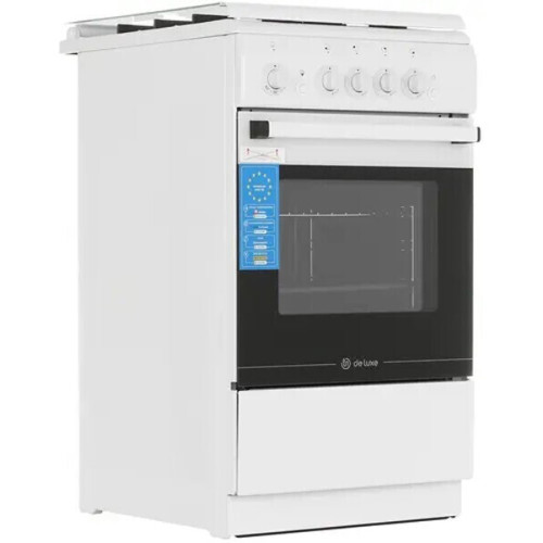 Газовая плита De Luxe в классическом белом корпусе объединила в себе целый набор традиционных возможностей для приготовления пищи. Для этого модель оснащена 4 конфорками и духовым шкафом объемом 54 л. Варочная поверхность прибора выполнена из эмалированной стали и дополнена чугунными решетками для установки посуды. Чтобы начать работу, нужно активировать прибор при помощи отдельной кнопки электроподжига. Это значит, что про спички и зажигалки можно забыть. За счет прозрачной стеклянной крышки, которой дополнена газовая плита, брызги супа и вторых блюд не испортят декоративное покрытие стены. Духовка дополнена опцией газ-контроля. Если огонь внезапно погаснет, топливо перестанет поступать к горелке. За счет встроенной подсветки вам не придется открывать дверцу, чтобы увидеть, как себя «ведут» пироги в камере. Снизу духового шкафа расположен ящик для хранения посуды.