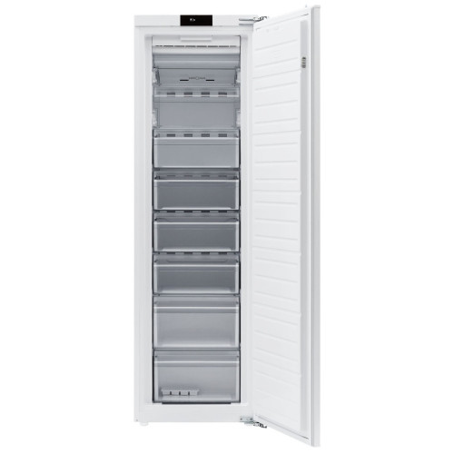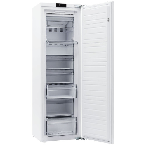 Встраиваемый высокий однокамерный морозильник GRETEL FNF шириной 60 см можно установить на кухне как отдельный элемент или в паре с высоким с холодильником. Вместительная морозильная камера с полезным объемом 197 л, оснащена 6 ящиками, 2 стеклянными полками для замораживания и хранения продуктов. Полностью автоматическая система охлаждения и разморозки No Frost предостерегает от образования наледи и инея на стенках морозильного отделения. Для вашего удобства модель GRETEL FNF предусматривает верхнюю LED-подсветку, которая освещает уровни хранения, а также современное интуитивно понятное сенсорное управление с дисплеем. Для быстрого охлаждения большого количества продуктов вы можете воспользоваться функцией Super Freeze. При активации данной функции происходит автоматическое понижение температуры в морозильной камере в течение 54 часов, по прошествии которых морозильник автоматически перейдет в обычный режим работы. GRETEL FNF отличается высоким классом энергоэффективности А+, благодаря которому годовое потребление электроэнергии составляет всего 297 кВт.