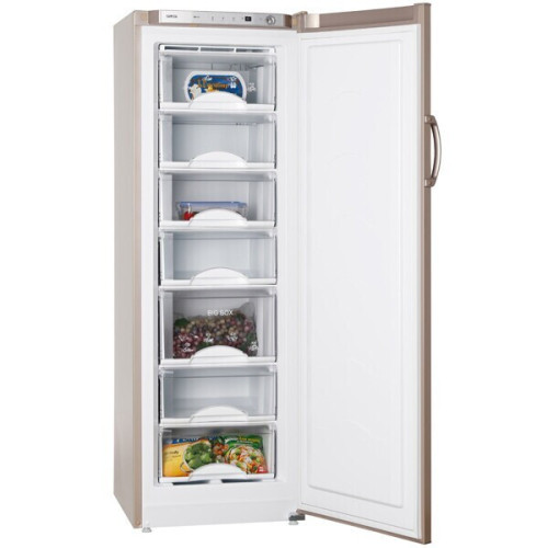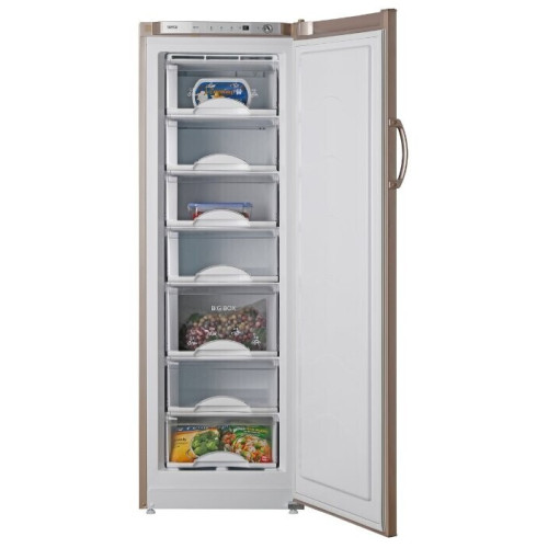 Если вы любите закупать продукты впрок или делаете сезонные заготовки, морозильная камера «Атлант» М 7204-190 может стать удобным решением. Её полезный объём 227 литров, в сутки она эффективно замораживает до 24 кг, так что подойдёт даже для хранения припасов большой семьи. Семь контейнеров позволят разложить продукты по типам: отдельно мясо, рыбу, овощи и фрукты. Один из ящиков увеличенного объёма (Big Box): в него поместятся «крупногабаритные» упаковки, например, высокое ведёрко с мороженым. Передние стенки ящиков выполнены из прозрачного пластика, так что вы легко найдёте всё, что нужно. Механическое управление прибором просто: уровень охлаждения регулируется при помощи привычного поворотного переключателя. Световой индикатор сигнализирует о повышении температуры, например, при одновременной загрузке в камеру большого количества тёплых продуктов. Отдельной кнопкой активируется режим «Замораживание», который пригодится при масштабной закупке свежих припасов. Передние ножки агрегата регулируются, что позволяет «сгладить» небольшие неровности пола. Сзади расположены колёсики для перемещения. Дверцу можно перенавесить, так что пользоваться морозилкой будет удобно в помещениях любой планировки.
