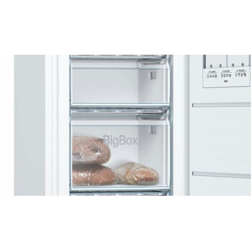 Вертикальная морозильная камера Bosch GSV29VW20R предназначена для хранения замороженных продуктов и полуфабрикатов. Эта универсальная модель походит для использования в городских квартирах и загородных домах. Благодаря продуманной конструкции её можно устанавливать вплотную к стенам, экономя место. Особенность этой морозильной камеры – ящик BigBox, высота которого составляет 29 см. В нём найдётся место даже для крупногабаритных продуктов. Благодаря несложной электронной системе управления, на освоение которой не потребуется много времени, владелец может точно установить необходимую температуру. Важная информация о состоянии морозильника выводится на матричный дисплей. В этой модели реализована технология FreshSense. Высокоточные датчики постоянно контролируют температуру и поддерживают её на установленном уровне, поэтому внутри морозильной камеры соблюдаются условия, при которых продукты могут храниться особенно долго. Функция суперзамораживания позволяет быстро подготовить продукты к длительному хранению. При этом их вкусовые свойства и привлекательный внешний вид практически не изменяются.