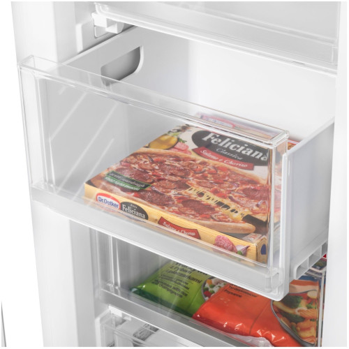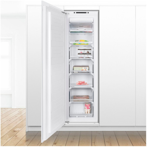 Современный встраиваемый морозильник высотой 177 см и объемом 203 л. Корпус шириной 54 см сделан из металла. Внутренняя часть выполнена из антибактериального белого пластика легкой очистки. Внизу, для удобства загрузки, располагаются 5 выдвижных ящиков, в верней части - 2 полки с крышками. В комплекте есть емкость для льда. Управление осуществляется электронным управлением с LCD дисплеем. С помощью него вы можете: выбрать необходимую температуру заморозки (-11°С, -13°С, -15°С, -17°С, -19°С, -21°С), активировать функцию глубокой заморозки включить/выключить холодильник. Предусмотрена возможность перенавешивания двери. Вы можете использовать данную модель как элемент расширения для встроенного холодильника MBL177SW и получить у себя на кухне систему Side by Side. Система охлаждения морозильной камеры - «No Frost». Холодный сухой воздух равномерно распределяется при помощи вентилятора по всей камере. Благодаря этому на продуктах и внутренних поверхностях морозилки не образовывается иней. Теперь вам никогда не придется размораживать холодильник. Климатический класс морозильника - ST. Это указывает на то, что он выполняет свои функции при температуре окружающей среды от +16°C до +38°С. Низкий уровень шума при работе компрессора (41 Дб) позволяет устанавливать его в кухне-гостиной. Класс энергопотребления: A+.